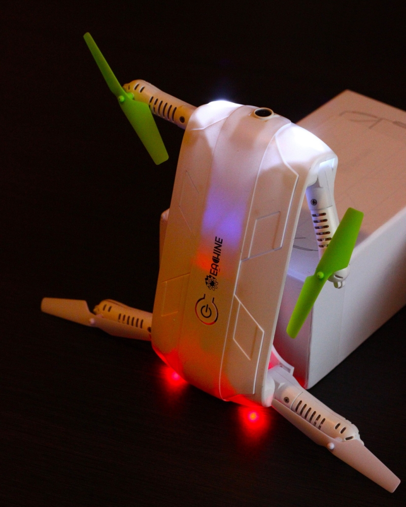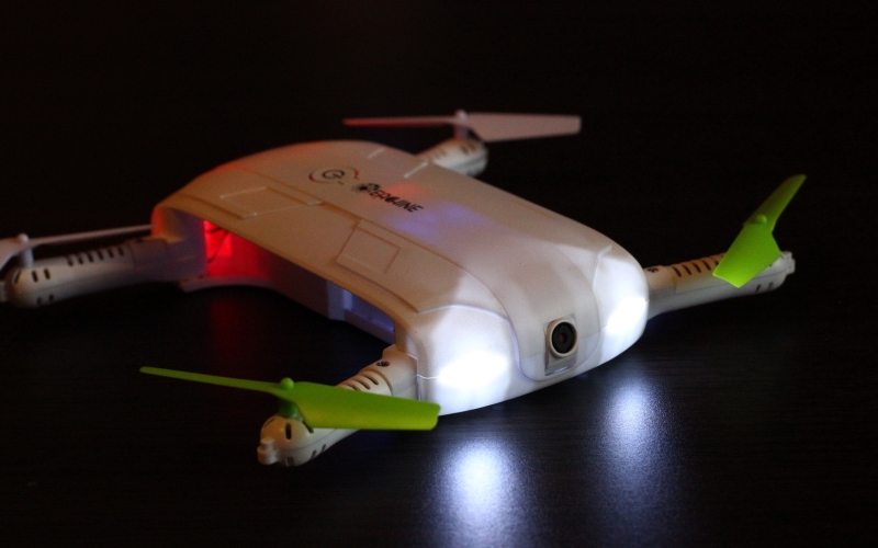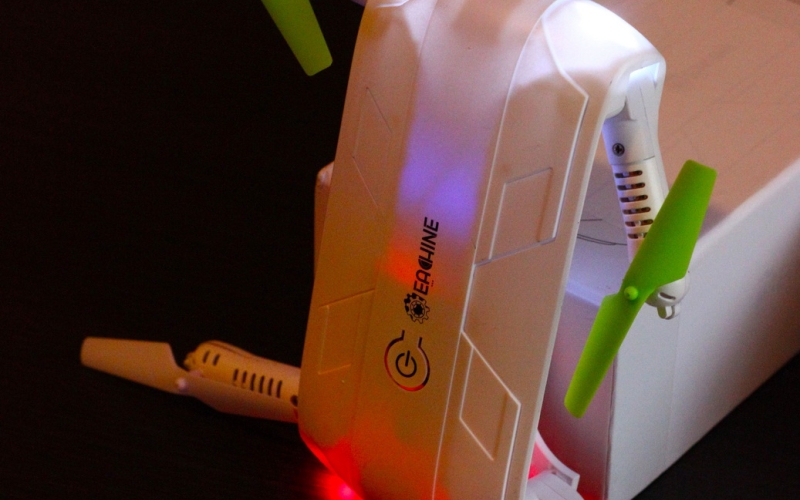 Kezdőknek kifejezetten hasznos segítségeket kapunk a dróntól, az első és hátsó propellerek színe más, elől fehér, hátul piros fények világítanak elég erősen, így könnyebb megállapítani az orientációt.