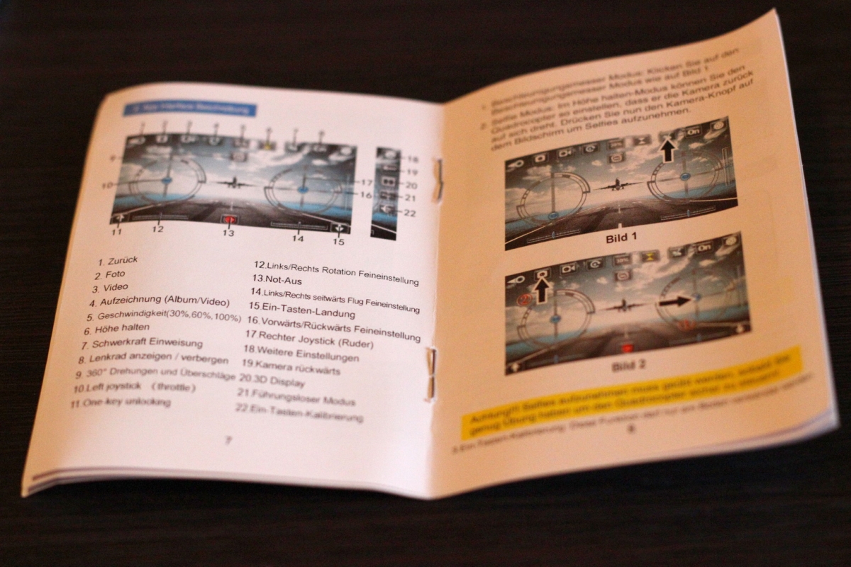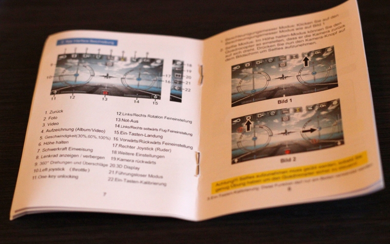 A doboz egyszerű, teljesen rendben van, a tartalma elég alap, kapjuk a gépet, egy darab aksit, töltőt, kézikönyvet (német és angol), taralék propellereket és tengelyeket, illetve a hordozó szütyőt.