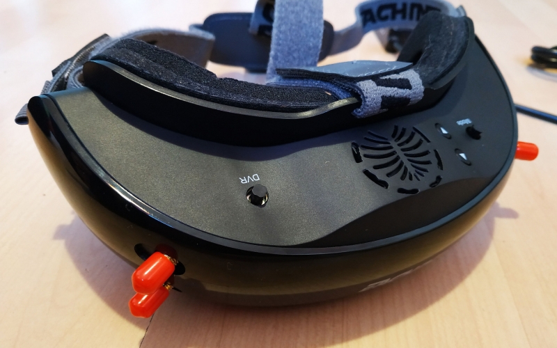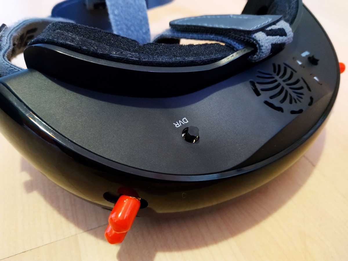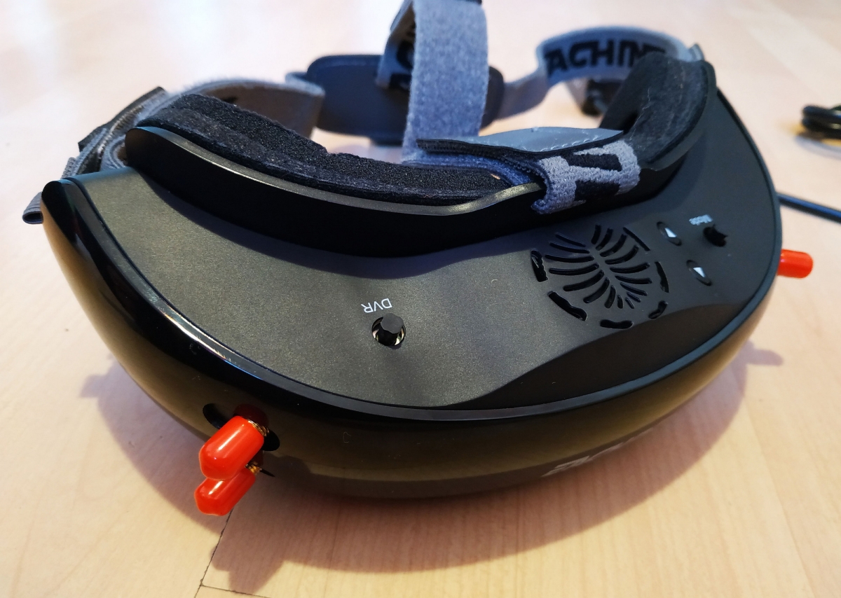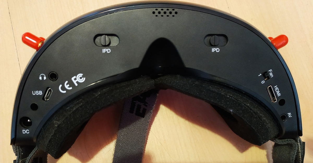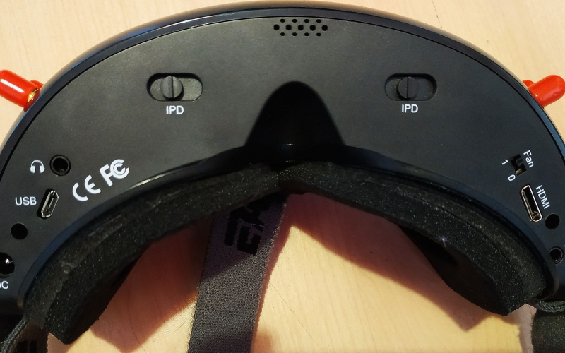 Az IPD 56-72mm között állítható, és a lencsék elé használhatjuk a Fatshark dioptriás előtét lencséit is. Itt találunk még USB csatlakozót FW frissítéshez, audio jack aljzatot, HDMI és AV bemenetet, és egy FAN 0-1 kapcsolót, amire nem jöttem rá mire jó, mert hogy ki nem kapcsolja az tuti, a manual sem ír róla semmit csak FAN on/off :)