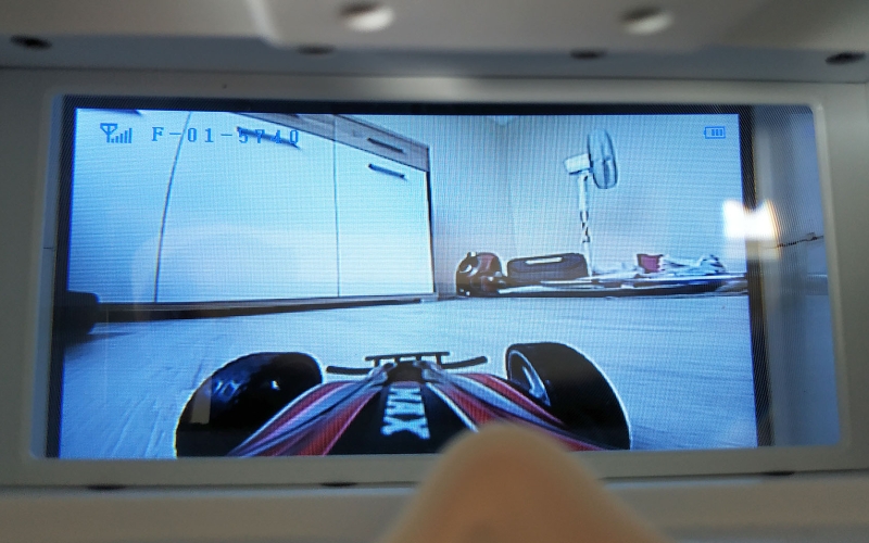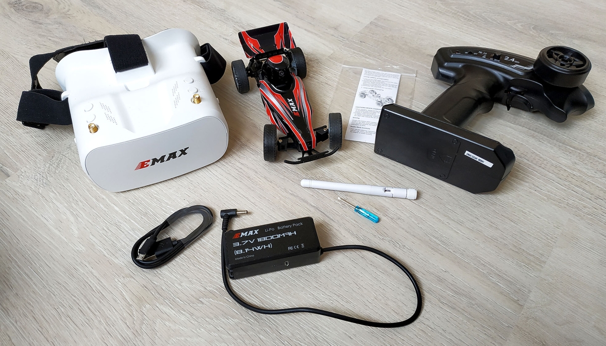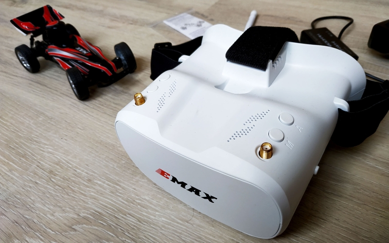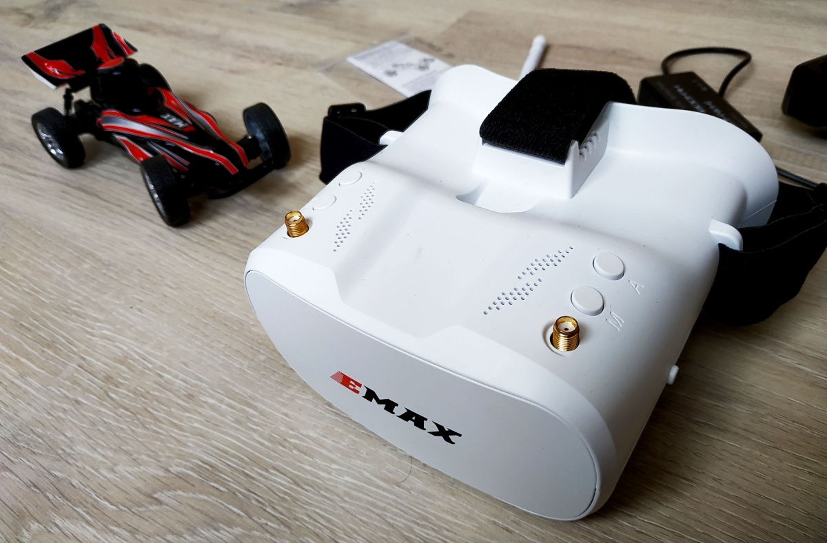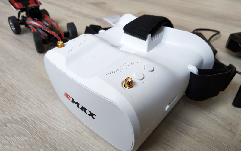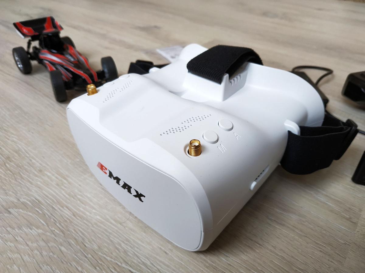 Talán ez az első komplett autós szett, amit FPV-vel szereltek fel, azaz itt nem külső nézetből irányítjuk a kocsit, hanem mint az FPV-s drónok esetében, egy kis kamera képét nézzük egy FPV szemüvegen keresztül. A kamera az ülésben van, így tényleg teljesen olyan mintha benne ülnénk. Azt kell mondjam, hogy nagyon élvezetes így vezetni ezt a kis autót. A videó adó 25mW-os, így itt is 100-200 méteres hatótávra számíthatunk. A kamera képe rendben van, nyilván egy olcsó típus van benne, de itt talán nem számít ez annyira, mint egy drón esetében. A szemüveg egyébként ugyanaz, mint amit a Tinyhawk RTF szettben kapunk, egy kezdésnek teljesen megfelelő szemcsiről van szó. Külön is megvásárolható Emax Tinyhawk 5.8G 48CH Diversity FPV Goggles. A szemüveg külső aksiról működik, ami egy tokban van és USB keresztül tölthető 18500-as akut tartalmaz.